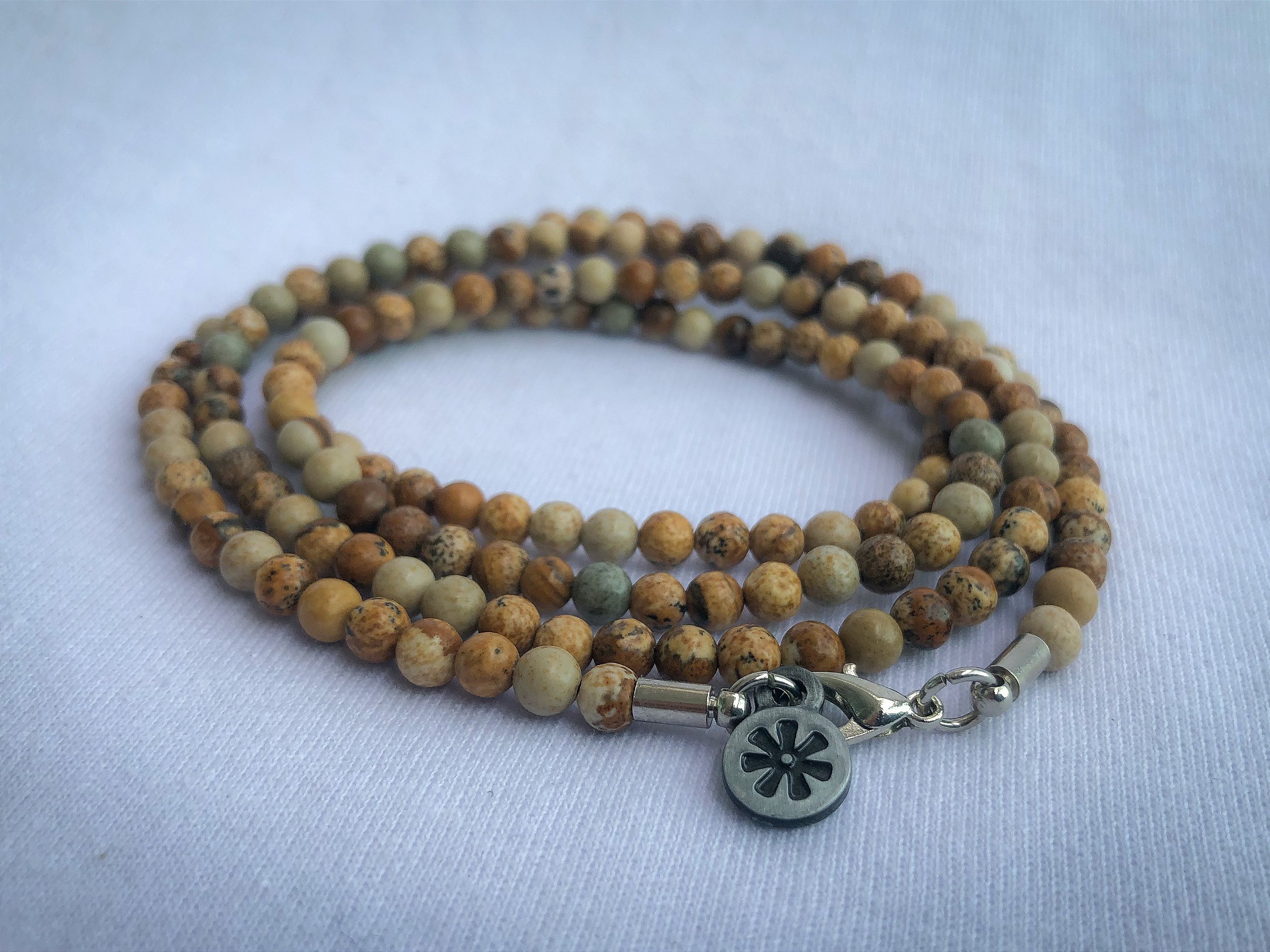 Colar de contas feita de pedra natural Jaspe Picture/Paisagem de 3 milímetros e fio de encerado flexível e resistente.