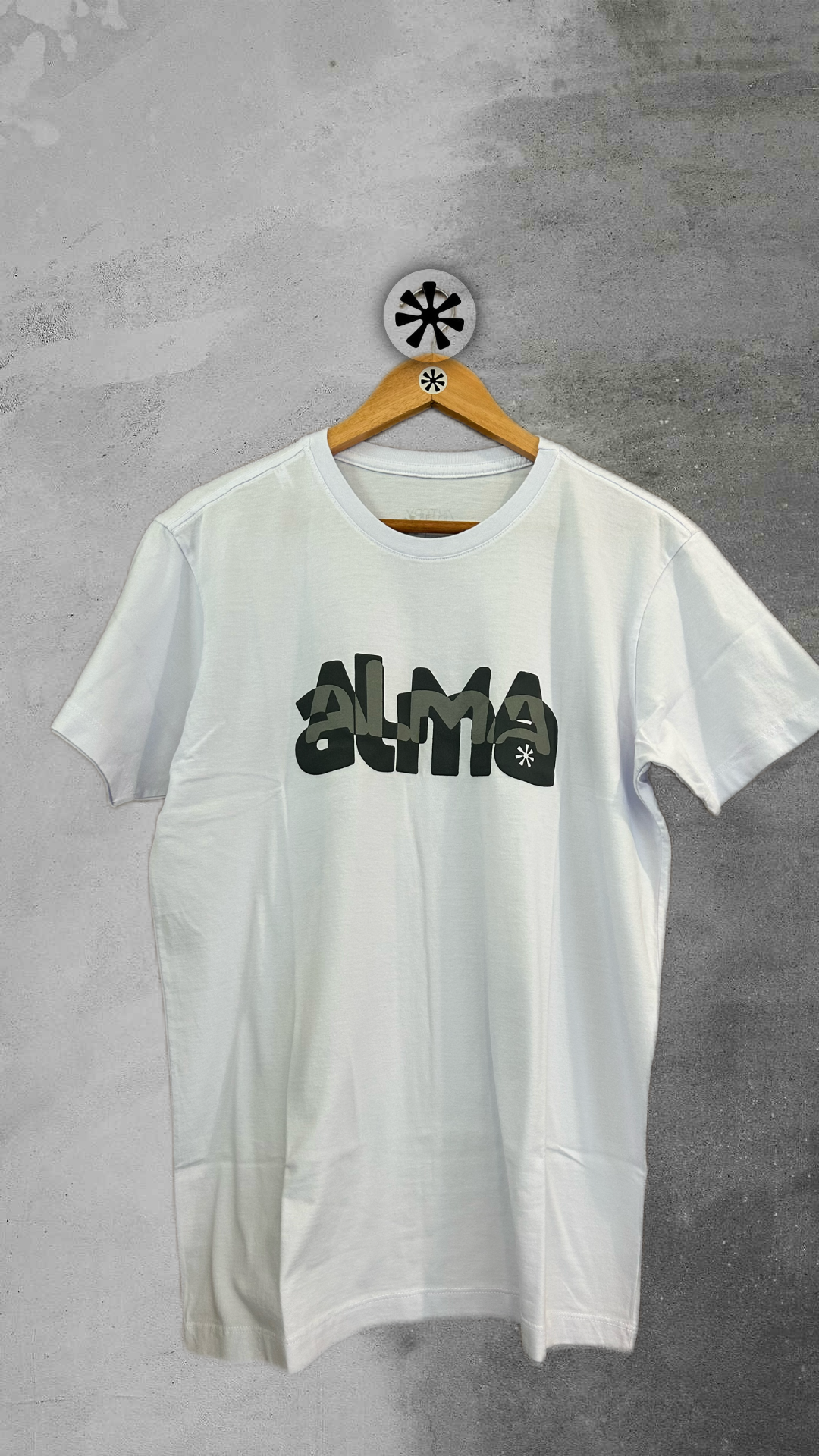 A T-shirt ALMA Akt é confeccionada em malha de algodão e processo de lavagem para efeito Comfort. A peça possui gola careca com acabamento liso, mangas regulares, estampa posterior, estampa frontal em escrita de cor contrastante, caimento reto, shape solto e acabamento pespontado.